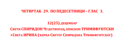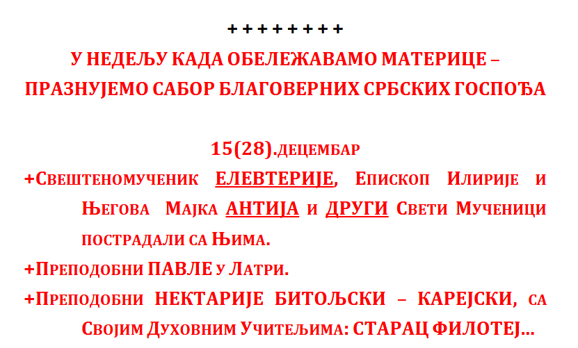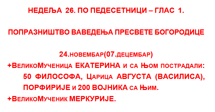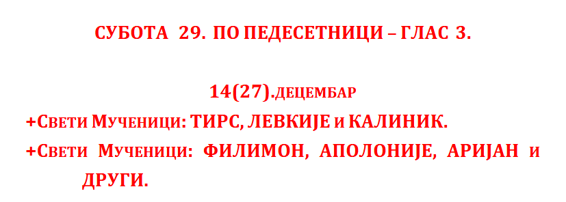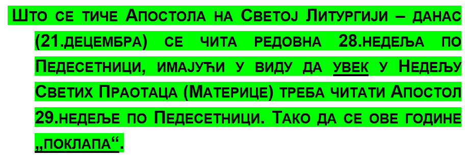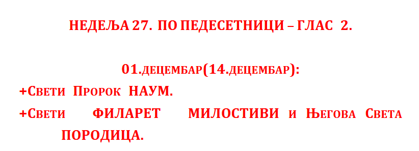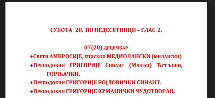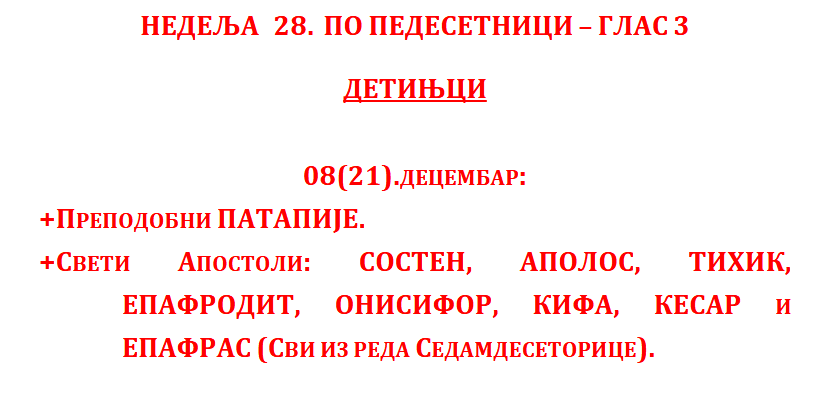 Богослужење ДЕЦЕМБАР 2025 Недеља 28.12.2025. АПОСТОЛ_нед.ПраотацаПреузми 12.28._СЛУЖБА_нед.Праотаца_гл.4Преузми Субота 27.12.2025. АПОСТОЛ_29.субПреузми 12.27._СЛУЖБА_суботаПреузми Четвртак 25.12.2025. 12.25._АПОСТОЛ_чет.29Преузми 12.25._СЛУЖБАПреузми Недеља 21.12.2025. 12.21._АПОСТОЛ_нед.28_гл.3Преузми 12.21._СЛУЖБА_нед.28(гл.3)Преузми Субота 20.12.2025. АПОСТОЛ_суб.28Преузми 12.20._СЛУЖБАПреузми Петак 19.12.2025. 12.19._АПОСТОЛ_пет.28Преузми 12.19._СЛУЖБА-2Преузми Недеља 14.12.2025. АПОСТОЛ_нед.27_гл.2Преузми 12.14._СЛУЖБА_нед.27(гл.2)Преузми Субота 13.12.2025. 12.13._АПОСТОЛ_27.субПреузми 12.13._Служба_СЛАВАПреузми 12.13._СЛУЖБАПреузми 12.09._АПОСТОЛ_27.утоПреузми 12.09._Служба_СЛАВАПреузми 12.09._СЛУЖБА-2Преузми Недеља 07.12.2025. 12.07._АПОСТОЛ_нед.26_гл.1Преузми 12.07._СЛУЖБА_нед.26(гл.1)Преузми Субота 06.12.2025. 12.06._АПОСТОЛ_26.субПреузми 12.06._СЛУЖБАПреузми Четвртак 04.12.2025. 12.04._АПОСТОЛ_26.чет-1Преузми 12.04._СЛУЖБА-3Преузми