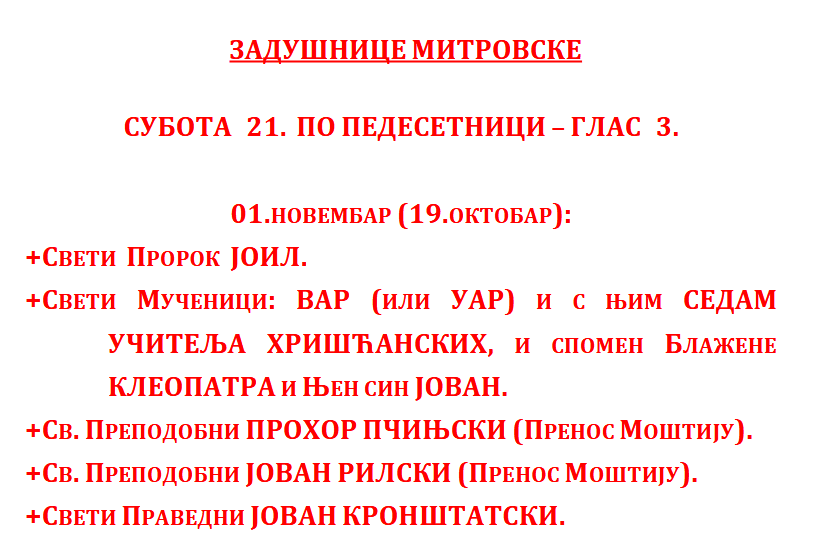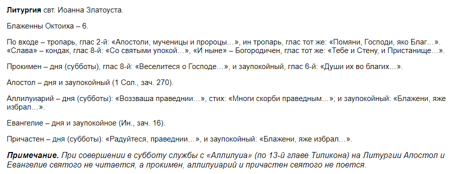 У Служби и Апостолу који су постављени за данашњи дан, налазе се поред Задушница и Тропари, Кондаци, Апостол за редовне дневне Свете.